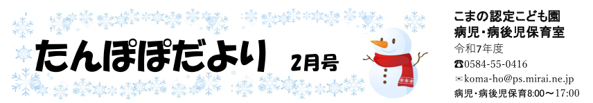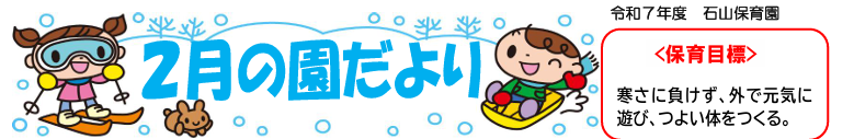 すくすくだより 2026.03.12 2月のすくすくだより<令和7年度> 当園の地域子育て支援拠点事業は、国及び県、市の補助事業を受けて運営しています。 <今月の保育目標>・★お友だちと一緒に遊…>>続きを読む