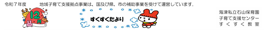 お知らせ 2025.12.03 12月のすくすくだより<令和7年度> 当園の地域子育て支援拠点事業は、国及び県、市の補助事業を受けて運営しています。 <今月の保育目標>・★お友だちと一緒に遊…>>続きを読む