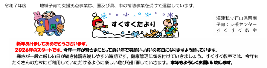 すくすくだより 2026.01.26 1月のすくすくだより<令和7年度> 当園の地域子育て支援拠点事業は、国及び県、市の補助事業を受けて運営しています。 <今月の保育目標>・★お友だちと一緒に遊…>>続きを読む